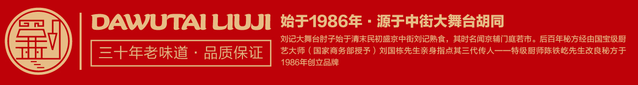 品牌創(chuàng)始人陳鐵屹先生自幼師承遼菜正宗,以發(fā)揚傳承遼味為己任。1986年,陳鐵屹先生經(jīng)師傅指導(dǎo)調(diào)制出第一鍋醬湯,自此開始制作熟食,并于市井銷售,食客絡(luò)繹不絕。作為中華美食的傳承者、開拓者和創(chuàng)新者,陳鐵屹先生于80年代創(chuàng)立“劉記大舞臺肘子”品牌,開出了第一家門店。基于百年秘方傳承改良,并采用新鮮放心原料,秘用二十幾味名貴藥材,延用傳統(tǒng)工藝專心加工而成,形成了色澤艷麗,酥爛脫骨,肥而不膩,瘦而不柴的風(fēng)味產(chǎn)品。